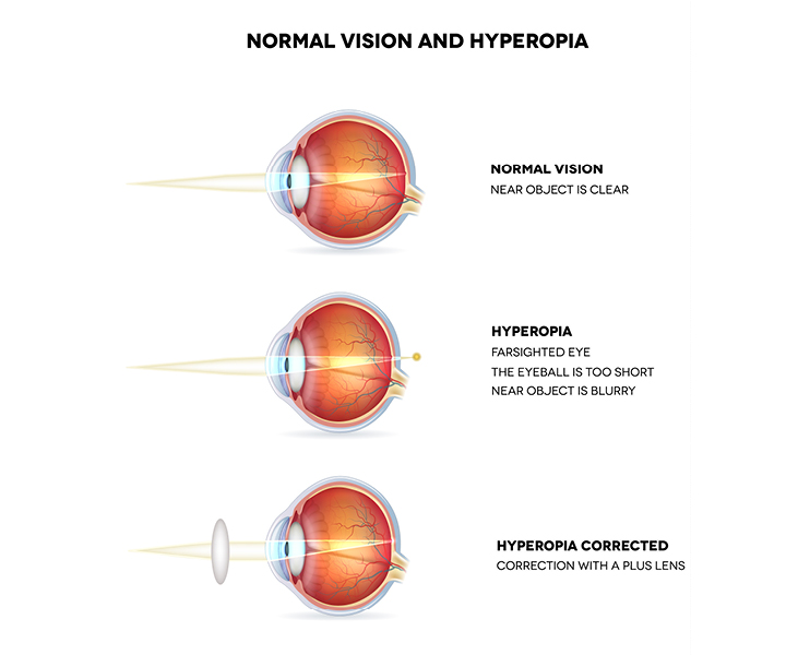Also know as Hyperopia or Hypermetropia, this is an optical defect causing difficulty focusing on near objects. To correct this defect, a convex lens will be required to realign the optics of the eye and restoring vision. If the optical defect is very extreme, focusing on objects at any distance can be difficult.