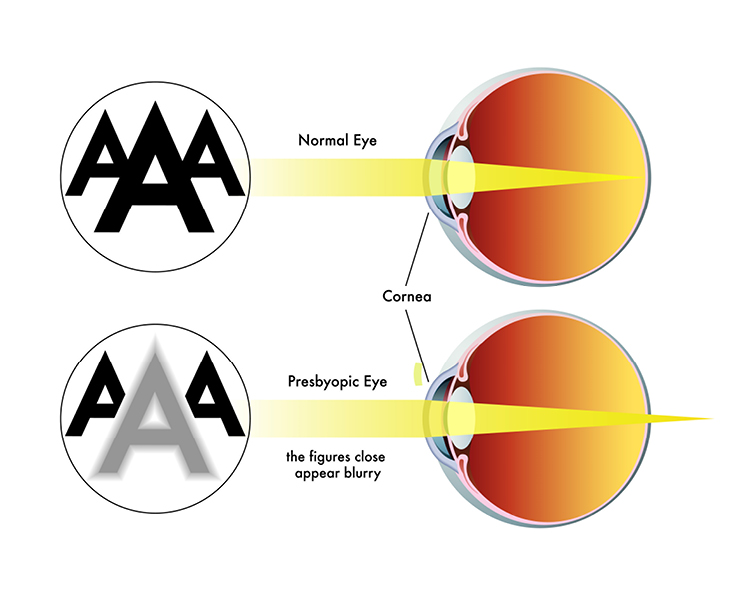 As you get older, the crystalline lens in the eye becomes less elastic. This hardening of the lens reduces the ability to change your focus from far to near. These changes can cause symptoms like difficulty to read books or threading a needle.