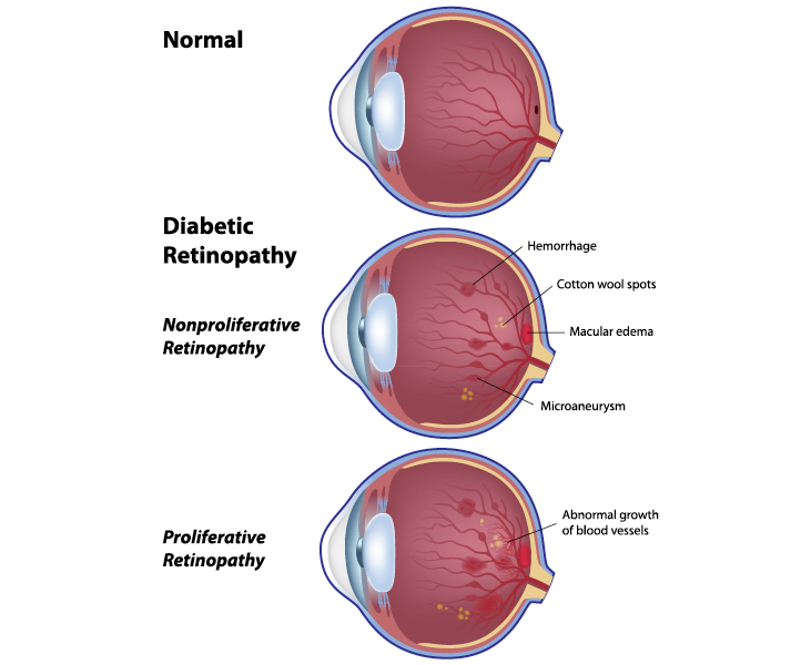 The back surface of the eyes is called the retina. The small blood vessels here can be damaged in diabetes, leading to the retinal problems. These changes are referred to as diabetic retinopathy. Unfortunately extensive retinopathy can lead to blindness.