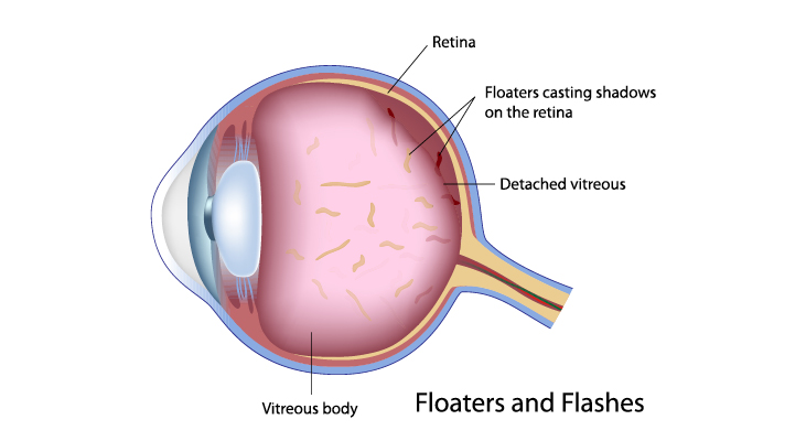 Most floaters are natural and safe. Occasionally they can indicate that the vitreous is separating from the retina, which is called a Vitreous Detachment. Sometimes, this can be a sign that a tear or hole in the retina has developed. These changes are normally painless, and can be associated with flashing lights in your vision.